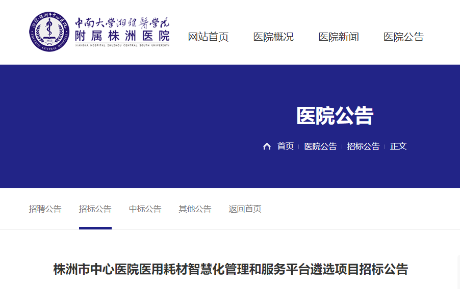 近日,湖南省株洲市中心医院宣布对本院医用耗材智慧化管理和服务平台遴选项目展开公开招标。