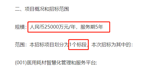 公告显示,本次项目合同期限为5年,预算金额为2.5亿元/年;同时文件明确表示本次的招标项目仅分为一个标段,且不允许联合体投标。