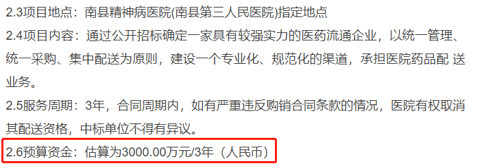 南县精神病医院(二甲)也于近日发布公开招标公告,计划每年3000万元,将其药品及医用耗材配送打包给1家供应商,服务周期为3年。