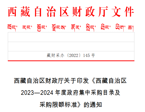 近日,西藏自治区财政厅发布《西藏自治区2023—2024年度政府集中采购目录及采购限额标准》(以下简称《采购目录》)。