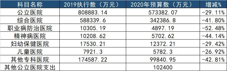 值得注意的是,在一般公共预算支出表中,国家卫健委明确,2020年公立医院的预算为573382.07万元,同比2019年的执行数减少了29.11%。