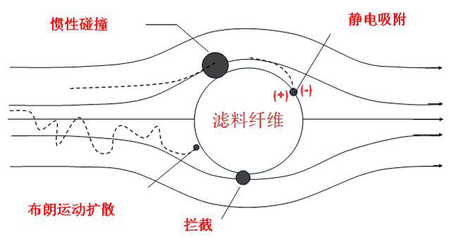 1. 扩散沉积:粒子布朗运动扩散位移到过滤纤维,受分子引力作用而被吸附。最易捕捉小尺度粒子、细纤维和低速运动的粒子。